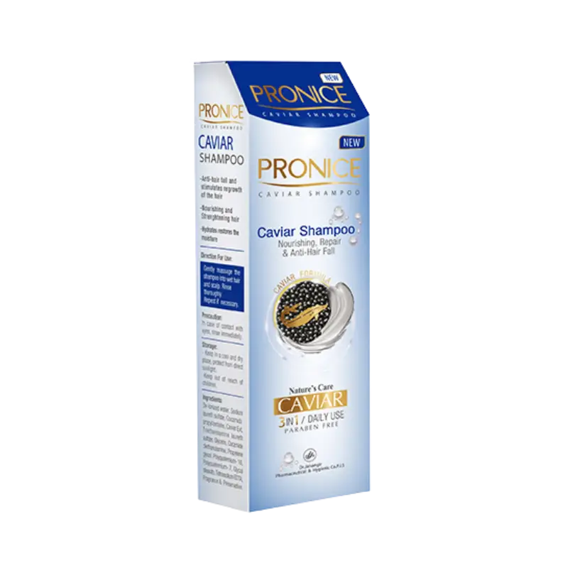 شامپو حاوی عصاره خاویار پرونایس، مناسب برای انواع مو، برای نخستین بار در ایران، مناسب پوست سر، تغذیه کننده، تقویت کننده و ضد ریزش مو، افزایش درخشندگی و لطافت مو، ترمیم موهای آسیب دیده با حفظ رطوبت طبیعی مو.